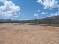 A rural landscape in Utah showcasing the vast open space and stunning mountain views. The dirt and gravel surfaces add texture to the natural scenery. Clouds hover in the day sky, creating a picturesque scene.