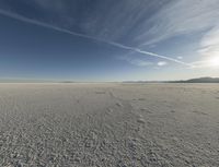 a lone snowboarder in the middle of nowhere under a cloudless sky is pictured on a beach