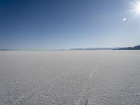 Open desert plain in Utah, with melting snow and sunlight shining on the horizon. The landscape is calm and serene, with a clear sky and a glimpse of the nearby salt lake. A picturesque natural environment near Salt Lake City.