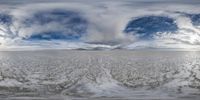 A panoramic view of an open field in Utah, with snowy mountains in the distance. The calm atmosphere and dramatic landscape create a sense of tranquility. A winter day in the natural environment of Salt Lake City.