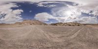 the panoramic image shows an empty field with rock formations in the background and clouds