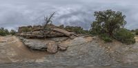 a tree growing out of some rocks along a river with mountains in the distance in front of a cloudy sky