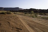 A scenic landscape in Utah, USA, featuring red rock formations and mountain slopes. The sandy terrain is dotted with vegetation and grass, while a road winds through the canyonlands. Clear skies complete the beautiful natural environment.