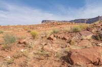 This is an image of a rugged landscape in Utah, USA. The desert terrain is characterized by red rock formations and canyons in the Canyonlands National Park. The mountainous area features grass and vegetation, along with dirt and gravel roads. The clear blue sky is dotted with clouds, adding to the natural beauty of the scenery. The rocky outcrops and bedrock provide a unique backdrop for off-road enthusiasts and nature lovers. This photo showcases the stunning landscapes and rugged beauty of the Utah desert.