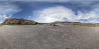 a fish - eye view of a desert landscape in a virtual format, with sky background