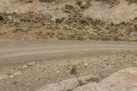 A person on a motorcycle rides along a road in Utah's San Rafael Swell. The landscape is characterized by red rock canyons, elevated mountains, and a gloomy grey sky. Off-road tracks and gravel road surfaces add to the adventurous nature of the area.