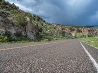 a highway going into the mountains with dark clouds overhead it is surrounded by some rocks
