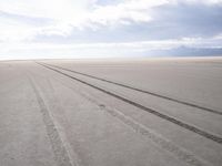 tire tracks on the sandy ground near mountains and clouds in background with no one running