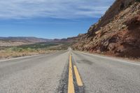 An asphalt road winds through the stunning red rock badlands of Utah. The straight road creates a captivating vista as it disappears into the canyonlands. Experience the beauty of Comb Ridge on a road trip in Utah.