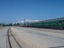 the sun is shining behind a train yard and field of grass in a circular photo