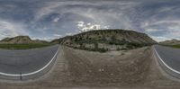 the 360 - lens has two pictures of a mountainous landscape in each image and there are mountains in the background