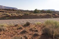 A rugged desert landscape in Utah, with red rock formations and shrubs scattered across the plain. Lock Hart Road cuts through the scene, leading to the magnificent Canyonlands. A clear sky showcases the beauty of this untamed nature.