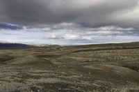 view across the vast plains under cloudy skies and dark clouds on a mountaintop with some small plants