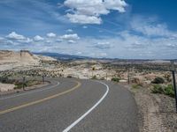 A rural road in Utah, winding through the stunning landscape of Head of the Rocks. Clear skies and fluffy clouds create a picturesque backdrop for this scenic drive.