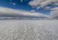 A breathtaking landscape of the Salt Lake desert in Utah, with majestic mountains in the background. The sun shines brightly over the open space, highlighting the salt-covered ground. Clear blue skies with fluffy clouds add to the beauty of the scene.