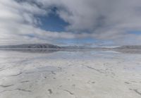 A picturesque landscape of Salt Lake City, Utah, showcasing the salt flats under the sunny sky. Majestic mountains and open spaces add to the desert scenery. Clouds drift peacefully in the clear day.