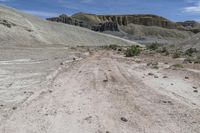 A dirt road winds through the rugged terrain of Utah's San Rafael Swell. Red rock formations and a dry plain create a captivating desert landscape. Explore the geology and beauty of Capitol Reef National Park.