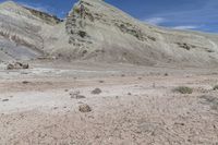a dirt field with a dirt mountain in the distance and some rocks, bushes, and sparse grass