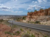 A scenic rural road in Utah, surrounded by beautiful nature. The asphalt road stretches into the distance, with clear skies and fluffy clouds above. An idyllic day for a drive in the USA.