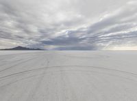 A dramatic landscape in Utah with snow-covered mountains and a vast open space. The grey sky adds to the dramatic effect. Salt Lake's salt surface creates a unique and natural environment.