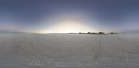 a snowmobile parked in the middle of a flat, empty snow field with a sky and mountains in the background