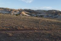 a man is walking along the dirt trail in the desert towards a rock formation in the distance