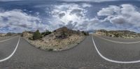 a 3d image of an empty road with clouds in the background on this photograph there are three lanes to go