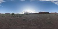A picturesque landscape in Utah, USA, with a gravel road winding through greenery and open spaces. The sun visible in the clear sky as it rises at dawn over the sandy and dirt surfaces.