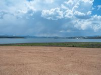 A breathtaking landscape in Utah, USA, featuring an open space with a serene lake. The clear sky and fluffy clouds reflect on the calm water. The dirt and gravel surface adds to the natural beauty of the surroundings.