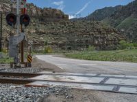 A scenic landscape in Utah, USA. The road, surrounded by mountains and nature, stretches into the distance. Clear skies and fluffy clouds create a picturesque day. A railway runs alongside the road.