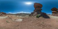 A majestic view of the Utah desert landscape, with red rock formations and a towering mountain in the background. The open space and rugged terrain make it ideal for off-road tracks and exploration. An aerial view reveals the vastness of this national park.