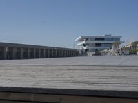 A composite material walkway with wooden deck and low-rise buildings in Valencia, Spain. The urban design showcases the city's unique architecture. Clear skies and a beautiful cityscape make for a perfect day in Europe.
