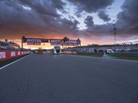 This is an image of a road in Valencia, Spain at dawn. The city skyline is silhouetted against the dramatic sky with clouds and contrails. The road is straight, with asphalt surface and dotted lines leading towards the horizon. In the foreground, there is a race track and stadium, adding to the sporty atmosphere. The image captures the drama and excitement of racing with the Armco barriers lining the road. Valencia is a beautiful city in Europe known for its stunning architecture and mountainous landscape.