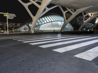 Valencia, Spain at night showcasing modern architectural design. The city's infrastructure is highlighted by a tall, futuristic structure. White crosswalks and artificial lights create a captivating urban scene.