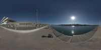 A stunning 360-view of Valencia's coastal area. Modern architecture meets the clear sky and calm sea. The beach, pier, and building reflect the city's urban design. A perfect vacation spot in Europe.