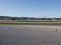 An airplane taking off from a runway in Valencia, Spain. The clear sky and blue skies overhead provide the perfect backdrop for this sporty event. The race track and city create an impressive profile against the plain horizon.