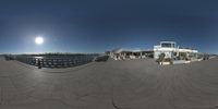 an artistic photo of a building in the center of a circle at the beach taken from inside a fisheye lens