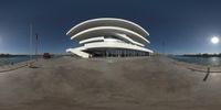 A fish-eye view captured on the boardwalk in front of the Museum of Art and Design in Valencia, Spain. Modern architecture blends with the coastal landscape. Clear skies and calm waters create a serene atmosphere.
