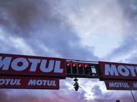 Dramatic dawn in Valencia, Spain. Asphalt road winds through the mountains, with cumulus clouds creating a dramatic backdrop. Race track signage adds to the racing atmosphere. An advertising banner displays on the track.