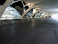 A modern urban landscape in Valencia, Spain, at night. Futuristic architecture with curved lines and sleek design. Concrete and metal structures contrast with the dark sky. Recreational spaces and street lights add artificial light in the S-curve cityscape.