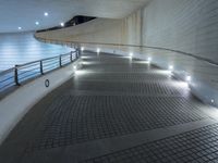 A nighttime cityscape in Valencia, Spain. Modern architecture lines the streets, with sleek buildings and curved staircases. Artificial lights illuminate the concrete roads and parking decks, creating a dark but vibrant urban atmosphere.