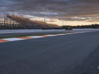 Dramatic race at a race track in Valencia, Spain. The sun sets in the horizon, casting a stunning light on the asphalt. The crowd watches in anticipation as the cars speed down the track.