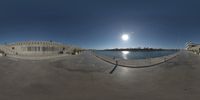 A modern skate park in Valencia, Spain, with empty ramps and stairs. The sun shines over the park, creating a clear sky and reflecting on the nearby water. A perfect spot for urban skateboarding and enjoying the coastal city.