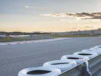 At sunset near an airport in Valencia, Spain, a race track is lined with tires. The clear sky reflects in the asphalt, setting the scene for an exhilarating automotive race. A perfect European dawn for racing enthusiasts.