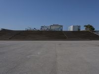 an empty stadium with some stairs in the distance under a clear sky above it is a ramp