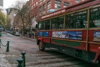 Classic architecture in Vancouver, Canada, under a grey sky. Wet cobblestone roads lead to charming storefronts and shops. A red double-decker bus with the number 53 is parked by the curb.