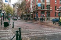 This image showcases the classic architecture and urban atmosphere of Vancouver, Canada. The grey sky sets a moody backdrop as rain drips down on the cobblestone road. Pedestrians can be seen crossing the crosswalk in front of the storefronts. The cityscape features a mix of traditional and modern buildings, an iconic symbol of Vancouver's architectural charm. The reflection of the buildings can be seen in the wet surface of the road. This photo captures a typical day in Vancouver, where the urban landscape and the elements come together to create a unique atmosphere.