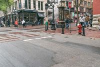 This is an image of a classic architecture storefront in Vancouver, Canada. The grey sky reflects the wet conditions of the day, with rain falling onto the cobblestone road and creating reflections on the water. The urban landscape showcases the city's unique architecture and features a crosswalk for pedestrians to safely navigate. The storefront houses a shop and adds to the vibrant atmosphere of the city. This photo captures the essence of Vancouver's urban charm on a rainy day.