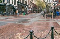 This is an image of a cityscape in Vancouver, Canada. The architecture showcases classic buildings with storefronts and cobblestone roads. The grey sky overhead indicates a rainy day, with wet surfaces reflecting the light. A road and crosswalk can be seen, suggesting urban activity. Water droplets can be seen on the pavement, indicating recent rainfall. This photo captures the unique combination of classic architecture and urban charm in Vancouver, Canada.