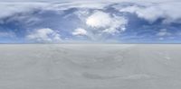 Experience the vastness of a salt flat under sunny skies. An endless desert landscape where sun and open space dominate, featuring occasional clouds above.